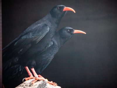 Red-billed choughs are a bird species belonging to the crow family. As the name suggests, the birds have a distinctive red beak and legs. Their downward curved beak is used to find insects in the soil and in the dung of grazing animals. Their Latin name Pyrrhocorax pyrrhocorax translates as flame raven and gave rise to the nickname ‘fire crow’.