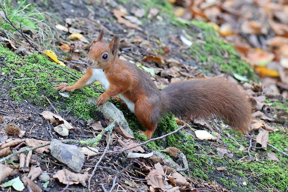 Characteristic red coat. Long bushy tail and ear tufts. Can be black, brown or white as well. Is smaller than the invasive grey squirrel. An adult weighs roughly 300 g.